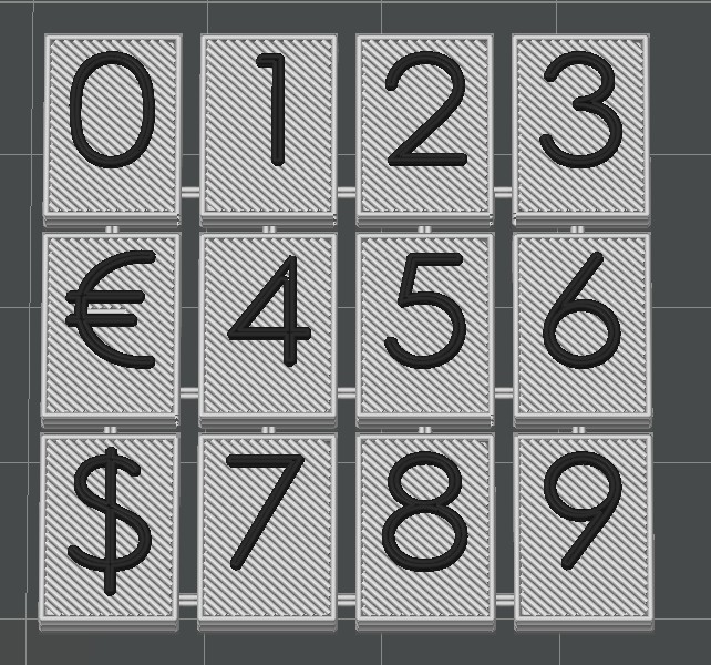 Cada ser incluye los números y símbolos: 0, 1, 2, 3, 4, 5, 6, 7, 8, 9, €, $.
